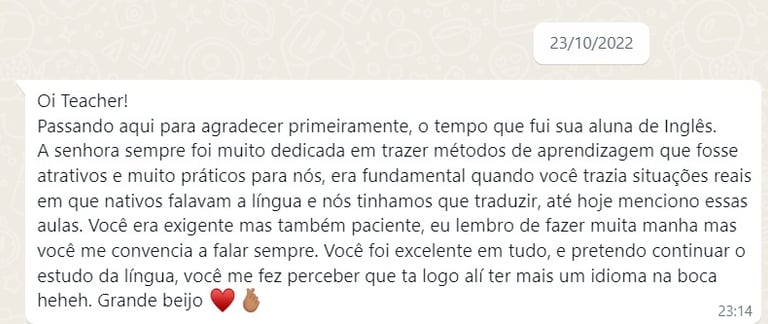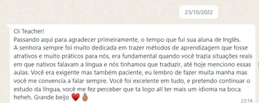 Eu não acredito em fluência “instantânea” e não cobro valores absurdos por algo que não entrego. Diferente de tantas “teachers” que você vê por aí, eu trabalho com o que realmente funciona: prática direcionada, conversação e acompanhamento próximo.